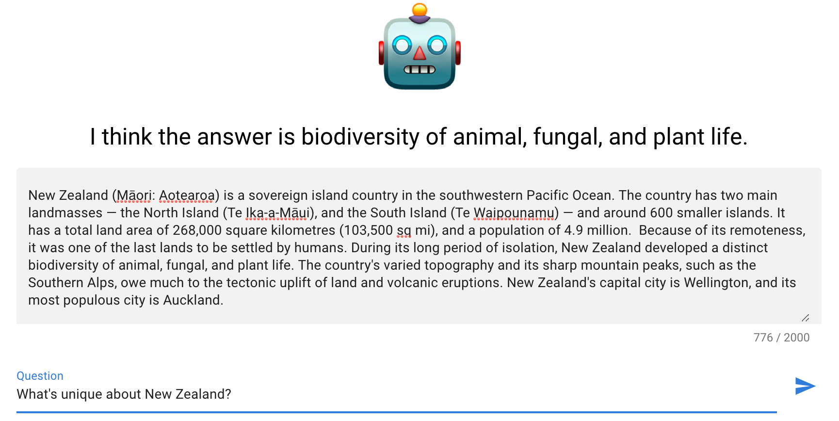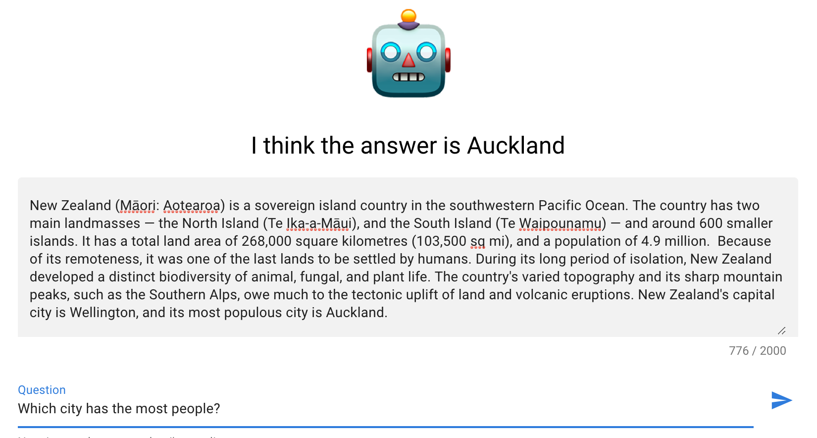 The first was a relatively straightforward test. I asked about the city with the most people, and it correctly answered it (note that the passage describes it as "most populous city", so is not word for word). Similar examples work just fine, such as "How many people does New Zealand have?"