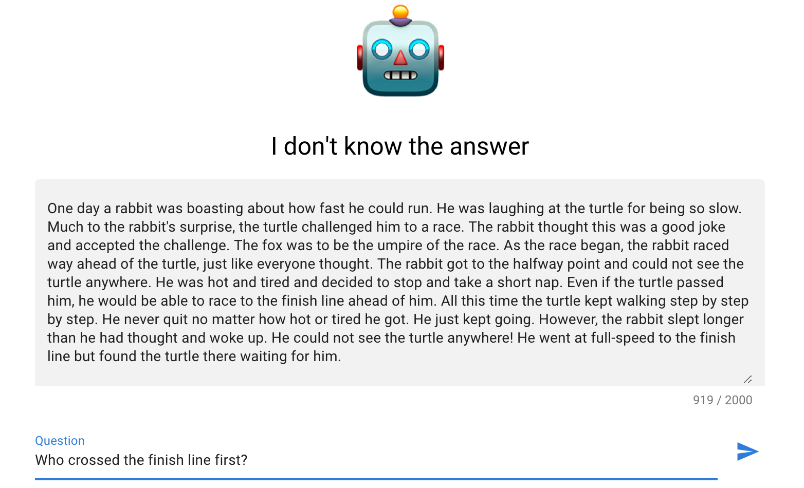 Here is one example where it does struggle. In order to answer this question, you must be able to infer that the turtle got there first from the sentence "found the turtle there waiting for him". The question answer system is unable to handle this level of abstraction.