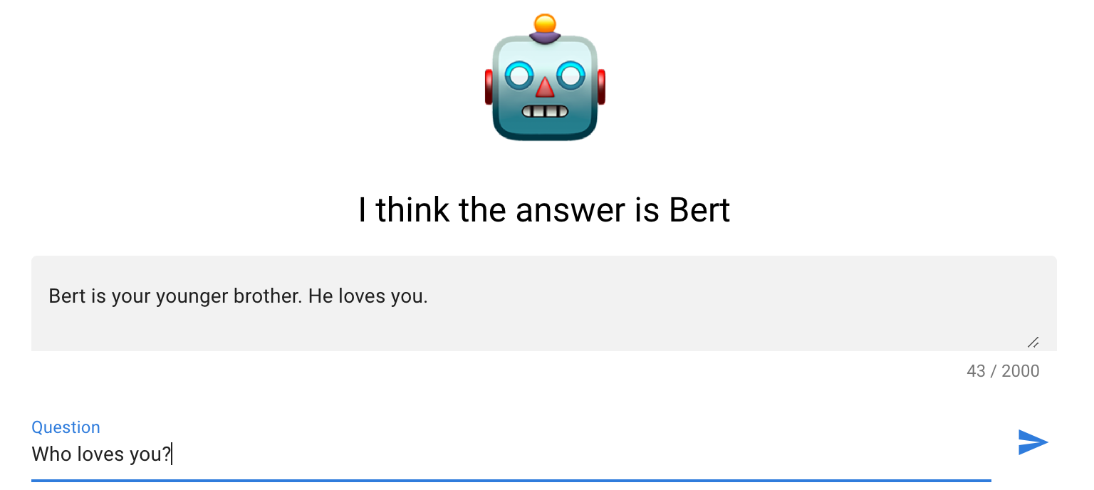 To test out the question answering capabilities of ALBERT, I built a small demo to play around with. The transformers library developed by the amazing team at Hugging Face provides an incredibly clean and easy to use implementation of the transformer models.